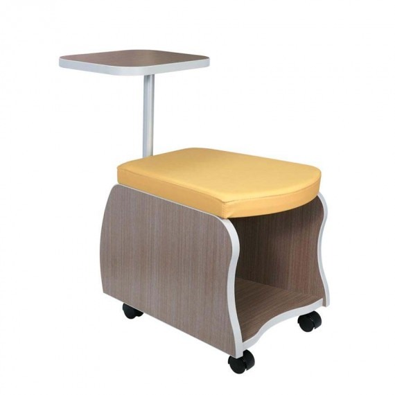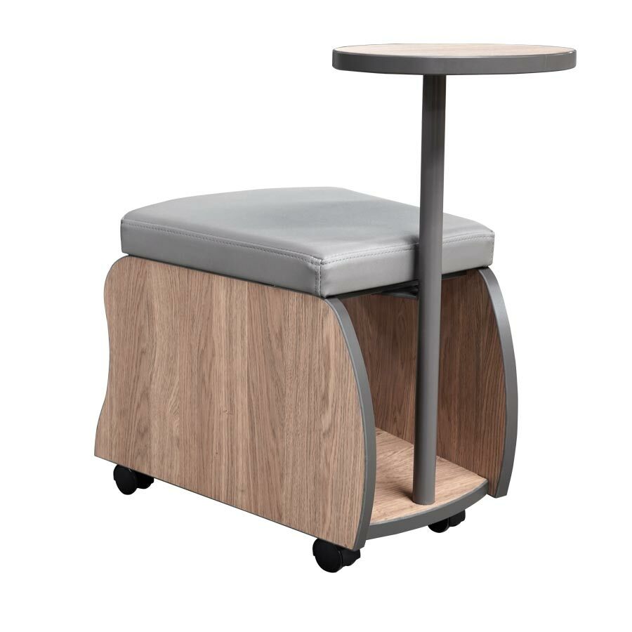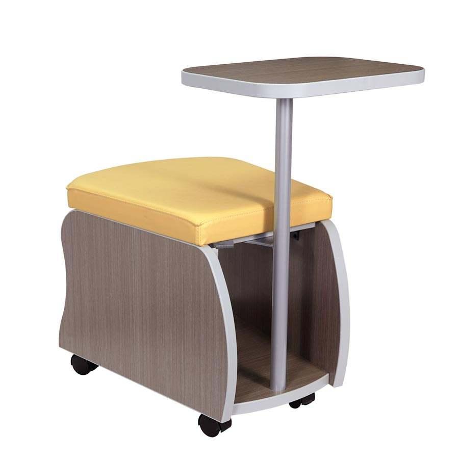 Mobile personal storage bench. Tapered seat awaits your upholstery choice. Interior and exterior of unit can be finished with high pressure laminate, or veneer of your choosing. RoJon is available with a tablet arm. Tablet arm is constructed of powder coated steel, choose from our powder coat selections for finish and high pressure laminate for work surface.